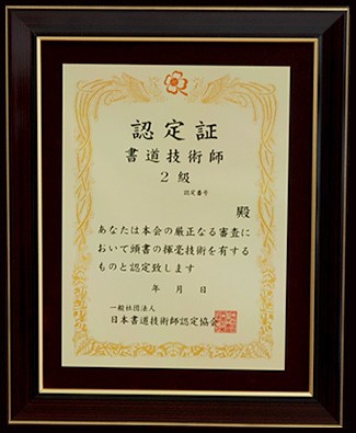 2級書道技術師とは、書道における基礎技術の取得している事はもちろんのこと毛筆の基本、楷書・行書・草書を揮毫出来る方。